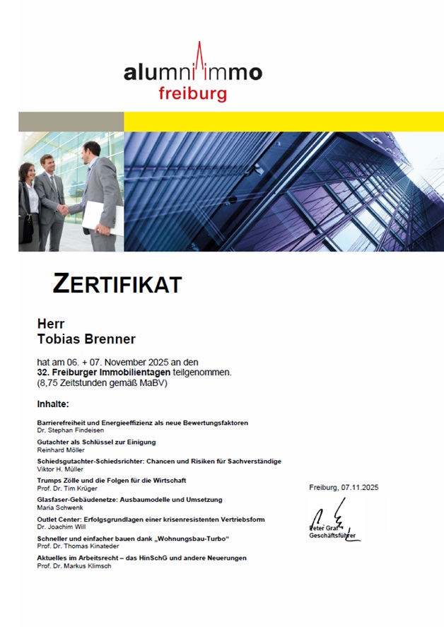 Am 06. und 07. November 2025 fanden die 32. Freiburger Immobilientage in Freiburg / Breisgau statt – veranstaltet von Alumni-Immo Freiburg an der DIA – Deutsche Immobilien-Akademie an der Universität Freiburg. Auch Tobias Brenner, Geschäftsführer der brenner IMMOBILIEN GmbH und Inhaber der brenner IMMOWERT, nahm an der renommierten Fachveranstaltung teil.
