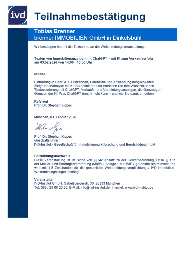 Am 03. Februar 2026 habe ich als Immobilienmakler in Dinkelsbühl an einer Online-Fortbildung des IVD – Immobilienverband Deutschland teilgenommen. Dabei ging es darum, wie moderne KI-Tools wie ChatGPT Makler dabei unterstützen können, Immobilienanzeigen effektiv, zielgruppengerecht und verkaufsstark zu erstellen.