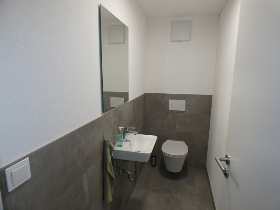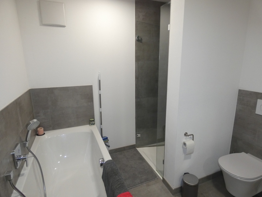 Im modernen Bad sind Dusche, Wanne und WC vorhanden. Hier kann auch die Waschmaschine installiert werden, ein Gäste-WC ist ebenfalls vorhanden.
