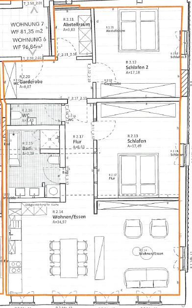 Wohn- Esszimmer mit offener Küche (u. Elektrogeräten), 2 Schlafräume, Bad, Gäste-WC, Abstellraum
