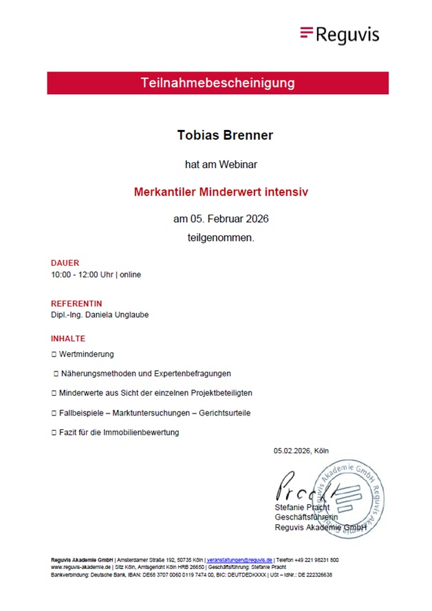 Als zertifizierter Immobiliengutachter nach DIN EN ISO/IEC 17024 ist die kontinuierliche fachliche Weiterbildung ein zentraler Bestandteil meiner Tätigkeit. Die Teilnahme an qualifizierten Fachseminaren wie dem Webinar der Reguvis Akademie dient nicht nur dem Nachweis der erforderlichen Weiterbildungsstunden, sondern vor allem der Sicherstellung einer qualitativ hochwertigen, marktgerechten und rechtssicheren Immobilienbewertung.